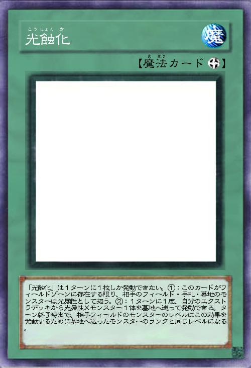 | 「光蝕化」は1ターンに1枚しか発動できない。①:このカードがフィールドゾーンに存在する限り、相手のフィールド・手札・墓地のモンスターは光属性として扱う。②:1ターンに1度、自分のエクストラデッキから光属性Xモンスター1体を墓地へ送って発動できる。ターン終了時まで、相手フィールドのモンスターのレベルはこの効果を発動するために墓地へ送ったモンスターのランクと同じレベルになる。 | |||