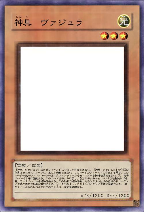 | 「神具 ヴァジュラ」は自分フィールドに1体しか存在できない。「神具 ヴァジュラ」の①②の効果はそれぞれ1ターンに1度しか発動できない。このカードがフィールドに存在する限り、このカードの元々のコントローラーはエクストラデッキからモンスターを特殊召喚できない。①:相手ターン終了時に発動する。このカードをデッキに戻し、自分のデッキからレベル4で光属性の「神具」モンスター1体を特殊召喚する。この効果で特殊召喚したモンスターは次の自分のドローフェイズ終了時まで効果が無効になる。②:自分のターンのスタンバイフェイズ時に発動できる。 相手フィールドのレベル2以下のモンスター全てを破壊する。 | |||