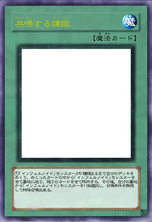 インフェルノイド最低5枚以上、理論上は最大13枚落とす墓地肥やし。自分のデッキ(アドラメ、ヴァエル、デカトロン、アスタロス、ルキフグス、ベルぜブル3枚。リリス、ネヘモス2枚)で2~30回検証したところ7~8枚肥やすのが精々で10枚以上落ちるのはほとんどありませんでした。よっておまけに蘇生効果を付けターン制限も無しにしとります」(2016-03-17 00:18)