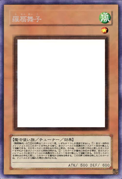 | 「羅扇舞妓」の①②の効果は1ターンに1度、いずれか1つしか使用できない。①:自分・相手のメインフェイズにこのカードを手札から捨て、自分フィールドの風属性モンスター1体を対象として発動できる。そのモンスターを持ち主の手札に戻す。その後、この効果で手札に戻したモンスターを手札から自分フィールドに特殊召喚する。②:このカードが墓地に存在する場合、自分スタンバイフェイズに自分フィールドの風属性モンスター1体を対象として発動できる。そのモンスターを持ち主の手札に戻し、このカードを墓地から特殊召喚する。この効果で特殊召喚したこのカードは、フィールドから離れた場合に除外される。 | |||