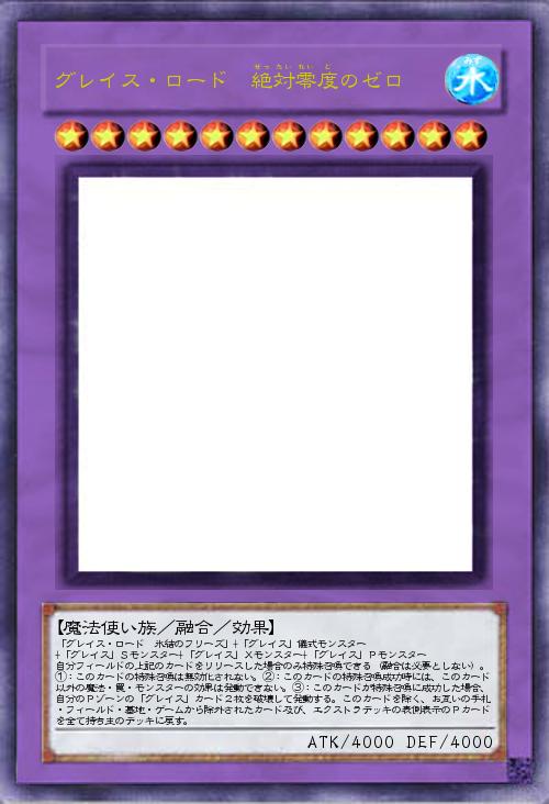 | 「グレイス・ロード 氷結のフリーズ」+「グレイス」儀式モンスター +「グレイス」Sモンスター+「グレイス」Xモンスター+「グレイス」Pモンスター 自分フィールドの上記のカードをリリースした場合のみ特殊召喚できる(融合は必要としない)。①:このカードの特殊召喚は無効化されない。②:このカードの特殊召喚成功時には、このカード以外の魔法・罠・モンスターの効果は発動できない。③:このカードが特殊召喚に成功した場合、自分のPゾーンの「グレイス」カード2枚を破壊して発動する。このカードを除く、お互いの手札・フィールド・墓地・ゲームから除外されたカード及び、エクストラデッキの表側表示のPカードを全て持ち主のデッキに戻す。 | |||