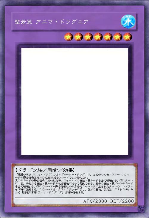 | 「龍姫の末席 アニマ・ドラグニア」+「カーシャ・ドラグニア」と名のつくモンスター このカードの融合召喚は元々の名前が上記のカードでしか行えない。 ①このカードの融合召喚に成功した時、フィールドの魔法・罠カードを全て破壊する。②1ターンに1度、手札から魔法・罠カード3枚を墓地に送って発動できる。相手の魔法・罠ゾーンのカードを全て破壊する。③このカードが融合召喚以外の方法でフィールドに出されたターンのエンドフェイズ時に発動する。このカードをエクストラデッキに戻し、自分の墓地、またはエクストラデッキから「龍姫の末席 アニマ・ドラグニア」を特殊召喚する。 | |||