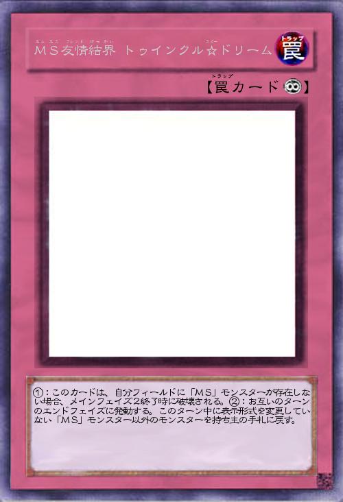 | ①:このカードは、自分フィールドに「MS」モンスターが存在しない場合、メインフェイズ2終了時に破壊される。②:お互いのターンのエンドフェイズに発動する。このターン中に表示形式を変更していない「MS」モンスター以外のモンスターを持ち主の手札に戻す。 | |||