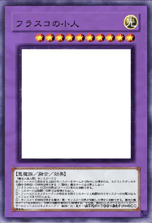 | 「魔法人造人間」モンスター×2 自分フィールドに存在する上記のモンスターをゲームから除外した場合のみ、エクストラデッキから融合召喚扱いで特殊召喚できる(「融合」魔法カードは必要としない) 「フラスコの小人」の③の効果は1ターンに1度のみ発動できる。 ①:このカードは戦闘・効果では破壊されない。 ②:フィールドにキメラトークンが存在する限りこのカードと戦闘を行うモンスターの攻撃力はエンドフェイズまで100となる。 ③:モンスターを特殊召喚する魔法・罠・モンスター効果が発動した場合に発動できる。墓地の魔法カード1枚を除外し、効果の発動を無効にし破壊する。その後、無効にしたカードのコントローラーのフィールドにキメラトークン(獣族・炎・星5・攻500/守500)1体を守備表示で特殊召喚する。 | |||