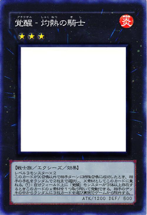 | レベル3モンスター×2 このカードがX召喚以外で相手ターンに特殊召喚に成功したとき、相手の手札をランダムで2枚まで選択し、X素材としてこのカードに重ねる。①:自分フィールド上に「覚醒」モンスターが3体以上存在するときこのカードのx素材を1つ取り除いて発動できる。相手のデッキの中からランダムに3枚カードを選び裏側でゲームから除外する。 | |||