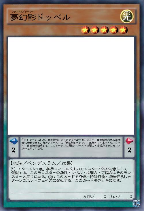 | ①:1ターンに1度、相手がエクストラデッキからモンスター1体を特殊召喚した場合に発動できる。自分フィールドに「夢幻影トークン」(水族・?・星?・攻/守?)1体を特殊召喚する。このトークンの属性・レベル・攻撃力・守備力はそのモンスターと同じになる。 | |||