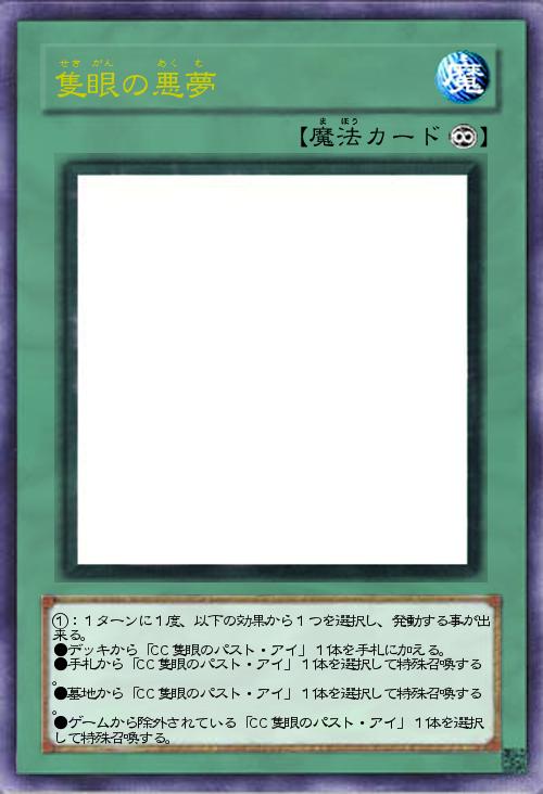 | ①:1ターンに1度、以下の効果から1つを選択し、発動する事が出来る。 ●デッキから「CC隻眼のパスト・アイ」1体を手札に加える。 ●手札から「CC隻眼のパスト・アイ」1体を選択して特殊召喚する。 ●墓地から「CC隻眼のパスト・アイ」1体を選択して特殊召喚する。 ●ゲームから除外されている「CC隻眼のパスト・アイ」1体を選択して特殊召喚する。 | |||