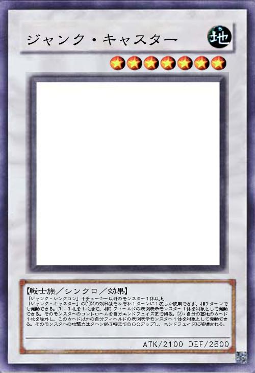 | 「ジャンク・シンクロン」+チューナー以外のモンスター1体以上 「ジャンク・キャスター」の①②の効果はそれぞれ1ターンに1度しか使用できず、相手ターンでも発動できる。①:手札を1枚捨て、相手フィールドの表側表示モンスター1体を対象として発動できる。そのモンスターのコントロールを自分エンドフェイズまで得る。②:自分の墓地のカード1枚を除外し、このカード以外の自分フィールドの表側表示モンスター1体を対象として発動できる。そのモンスターの攻撃力はターン終了時まで800アップし、エンドフェイズに破壊される。 | |||