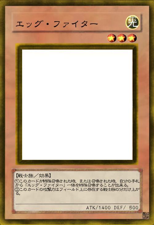 | ①このカードが特殊召喚された時、または召喚された時、自分の手札から「エッグ・ファイター」一体を特殊召喚することが出来る。 ②このカードの攻撃力はフィールド上に存在する戦士族の分だけ上がる。 | |||