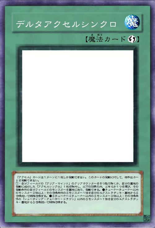 | 「アクセル」カードは1ターンに1枚しか発動できない。このカードの発動に対して、相手はカードを発動できない。 ①:自分フィールドの「クリア・マインド」のクリアカウンターを5つ取り除くか、自分の墓地の発動に成功した「アクセルシンクロ」1枚を除外し、以下の効果の内、どちらか1つを選び、その発動条件の自分フィールドのモンスターを墓地に送り、発動できる。●チューナーチューナー以外のモンスター2体以上:その召喚条件のSモンスター1体を自分のエクストラデッキ・墓地からS召喚扱いで特殊召喚する。●Sチューナー+チューナー以外のSモンスター2体以上:その召喚条件の「シューティング・クェーサー・ドラゴン」以外のSモンスター1体を自分のエクストラデッキ・墓地からS召喚扱いで特殊召喚する。 | |||