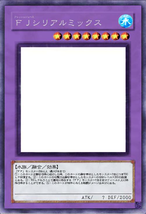 | 「FF」モンスター2体以上(最大5体まで) ①:このカードが融合召喚に成功した時、このカードの融合素材としたモンスター1体につき700LP回復する。②:このカードの攻撃力は融合素材としたモンスターの合計レベル×300の数値となる。③:700LP払うことで墓地に存在する「FF」モンスター1体を自分フィールド上に特殊召喚することができる。④:このカードが相手に与える戦闘ダメージは半分になる。 | |||