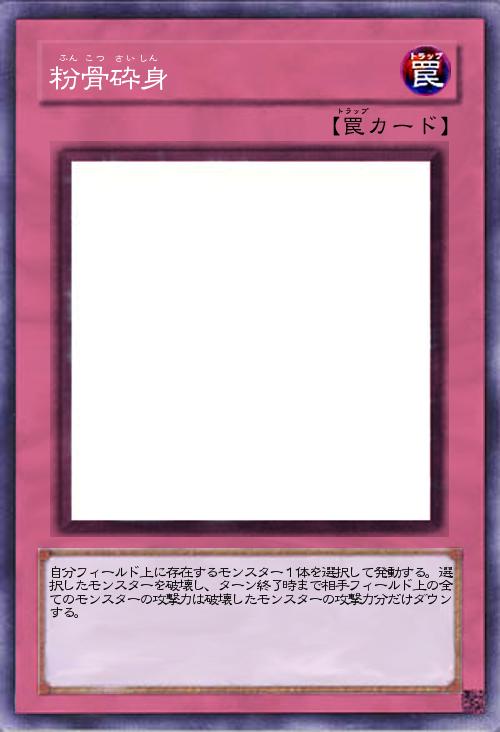 | 自分フィールド上に存在するモンスター1体を選択して発動する。選択したモンスターを破壊し、ターン終了時まで相手フィールド上の全てのモンスターの攻撃力は破壊したモンスターの攻撃力分だけダウンする。 | |||