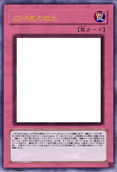 | 「JOD決死の救出」の①②の効果は1ターンにいずれか一つしか発動できず、発動ターン終了時まで相手が受ける全てのダメージは0になる。①:自分モンスターが破壊された場合に発動できる。発動ターン終了時に自分モンスターがフィールド上に存在する場合、発動ターン中で破壊されたモンスターを全て手札に戻すことができる。その後、デッキから1枚ドローする。②:墓地のこのカードを除外し、墓地のモンスター1体を対象とすることで発動できる。対象モンスターを手札に戻し、対象モンスターのレベルまたはランク×300LPを回復する。この効果は相手ターンでも発動できる。 | |||