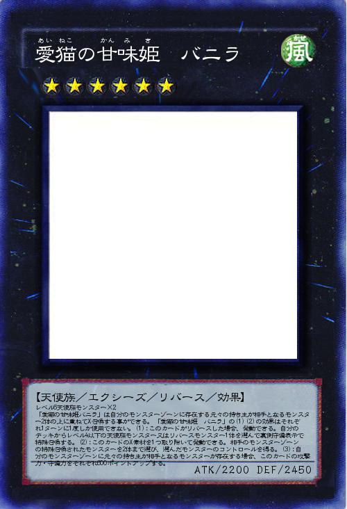 | レベル6天使族モンスター×2 「愛猫の甘味姫バニラ」は自分のモンスターゾーンに存在する元々の持ち主が相手となるモンスター2体の上に重ねてX召喚する事ができる。「愛猫の甘味姫 バニラ」の(1)(2)の効果はそれぞれ1ターンに1度しか使用できない。(1):このカードがリバースした場合、発動できる。自分のデッキからレベル4以下の天使族モンスター又はリバースモンスター1体を選んで裏側守備表示で特殊召喚する。(2):このカードのX素材を1つ取り除いて発動できる。相手のモンスターゾーンの特殊召喚されたモンスターを2体まで選び、選んだモンスターのコントロールを得る。(3):自分のモンスターゾーンに元々の持ち主が相手となるモンスターが存在する場合、このカードの攻撃力・守備力をそれぞれ600ポイントアップする。 | |||