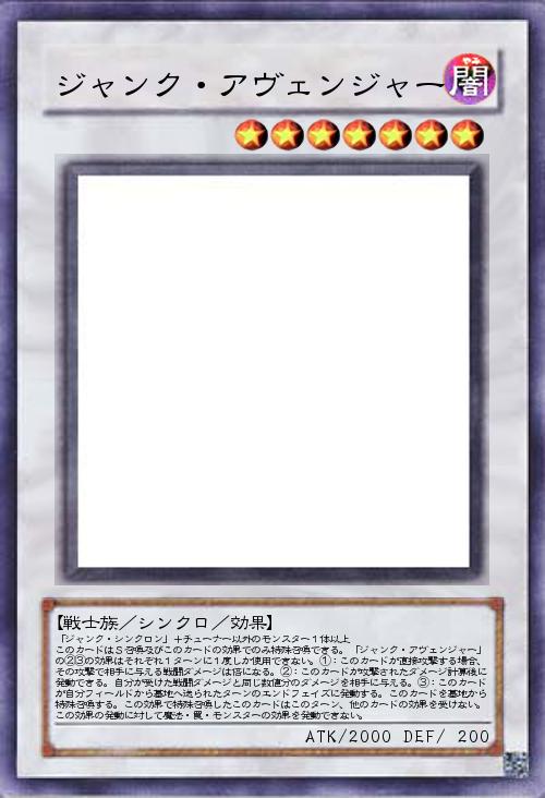 | 「ジャンク・シンクロン」+チューナー以外のモンスター1体以上 このカードはS召喚及びこのカードの効果でのみ特殊召喚できる。「ジャンク・アヴェンジャー」の②③の効果はそれぞれ1ターンに1度しか使用できない。①:このカードが直接攻撃する場合、その攻撃で相手に与える戦闘ダメージは倍になる。②:このカードが攻撃されたダメージ計算後に発動できる。自分が受けた戦闘ダメージと同じ数値分のダメージを相手に与える。③:このカードが自分フィールドから墓地へ送られたターンのエンドフェイズに発動する。このカードを墓地から特殊召喚する。この効果で特殊召喚したこのカードはこのターン、他のカードの効果を受けない。この効果の発動に対して魔法・罠・モンスターの効果を発動できない。 | |||