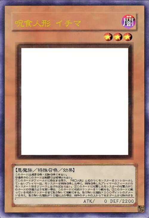 | このカードは通常召喚・反転召喚できない。 守備表示のこのカードは戦闘では破壊されない。 ①このカードがフィールドに存在する限り、「呪○人形」と名のつくモンスターをコントロールしていないプレイヤーは、モンスターを特殊召喚した時に、特殊召喚したプレイヤーのフィールドのモンスター1体をリリースしなければならない。②このカードに攻撃したモンスターの攻撃力がこのカードの守備力よりも高い場合、このカードに呪殺カウンターを1つ載せる。③このカードに載っている呪殺カウンターを全て取り除いて発動できる。取り除いた個数×200ポイントのダメージを与え、取り除いた個数が10個以上の場合、相手のデッキの上から7枚をゲームから除外する。 | |||