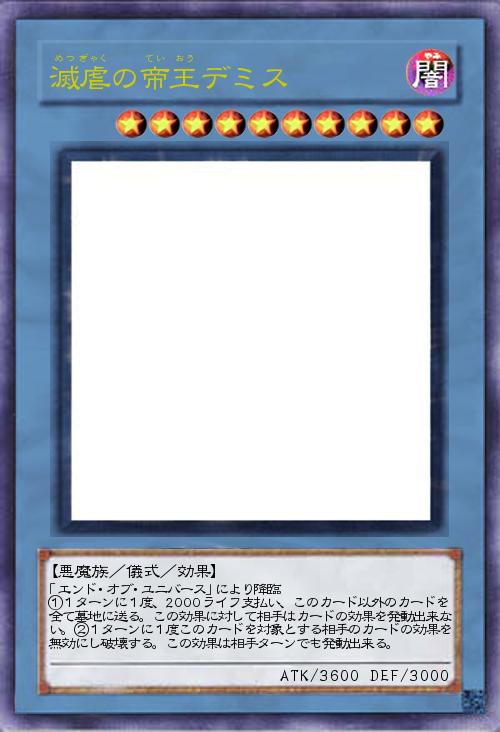 | 「エンド・オブ・ユニバース」により降臨 ①1ターンに1度、2000ライフ支払い、このカード以外のカードを全て墓地に送る。この効果に対して相手はカードの効果を発動出来ない。②1ターンに1度このカードを対象とする相手のカードの効果を無効にし破壊する。この効果は相手ターンでも発動出来る。 | |||