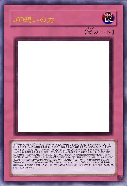| 「JOD想いの力」の②の効果は1ターンに1度しか発動できない。また、自分フィールド上に「JOD」モンスターが5体存在する場合、このカードは手札から発動することができる。①:自分フィールド上に「JOD」モンスターが2体以上存在し、その内にレベル3以下の「JOD」モンスターが1体以上存在する場合に「JOD」モンスター1体を対象として発動できる。ターン終了時まで、対象モンスター以外のレベル3以下の「JOD」モンスターの攻撃力の合計を対象モンスターの攻撃力に加えて、対象モンスターの攻撃力を倍にする。②:墓地にこのカードとレベル4以下の「JOD」モンスターが存在する場合に、このカード以外の「JOD」カード1枚を除外することで発動できる。このカードをデッキに戻し、墓地のレベル4以下の「JOD」モンスター1体を手札に加える。この効果を発動したターン。手札に加えたモンスター及び同名カードを召喚・特殊召喚す | |||