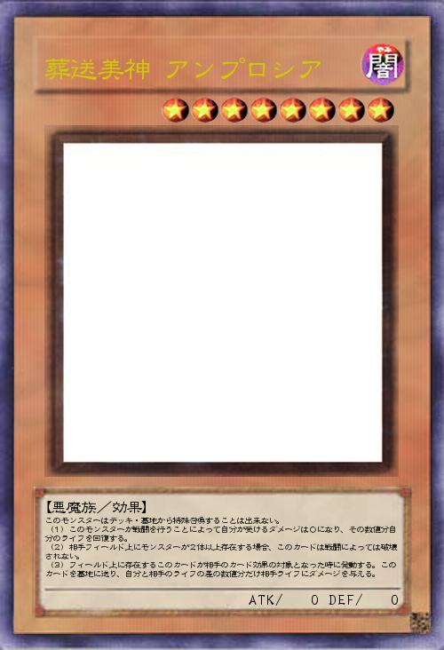 | このモンスターはデッキ・墓地から特殊召喚することは出来ない。 (1)このモンスターが戦闘を行うことによって自分が受けるダメージは0になり、その数値分自分のライフを回復する。 (2)相手フィールド上にモンスターが2体以上存在する場合、このカードは戦闘によっては破壊されない。 (3)フィールド上に存在するこのカードが相手のカード効果の対象となった時に発動する。このカードを墓地に送り、自分と相手のライフの差の数値分だけ相手ライフにダメージを与える。 | |||