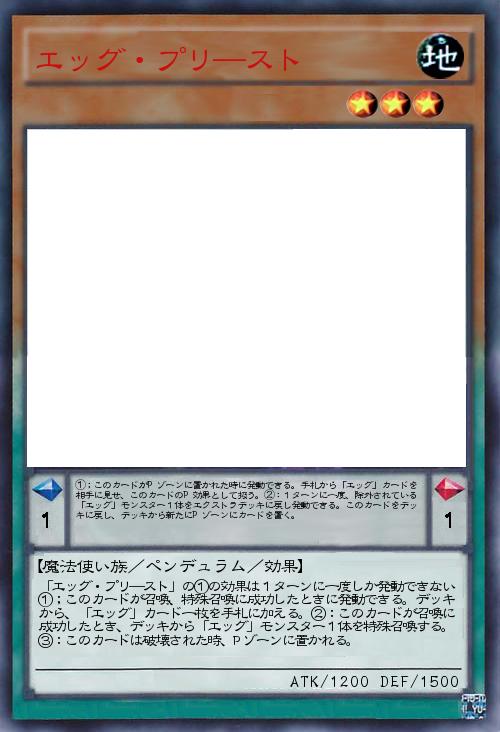 | 「エッグ・プリ―スト」の①の効果は1ターンに一度しか発動できない ①;このカードが召喚、特殊召喚に成功したときに発動できる。デッキから、「エッグ」カード一枚を手札に加える。②:このカードが召喚に成功したとき、デッキから「エッグ」モンスター1体を特殊召喚する。③:このカードは破壊された時、Pゾーンに置かれる。 | |||