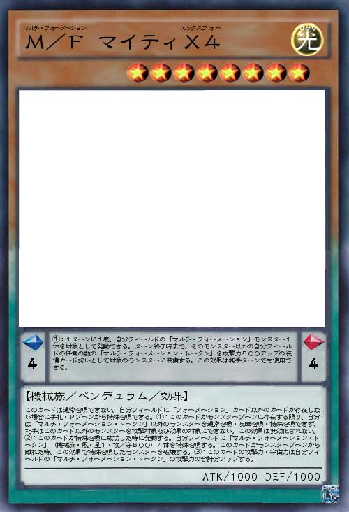 マイティX4はこのカテゴリの展開の基点となるカードの1つで、特殊召喚時にマルチ・フォーメーション・トークンを4体生成します。
