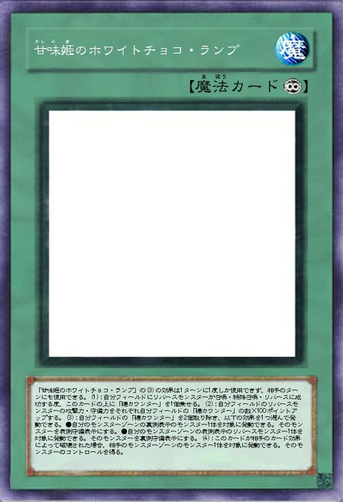 | 「甘味姫のホワイトチョコ・ランプ」の(3)の効果は1ターンに1度しか使用できず、相手のターンにも使用できる。(1):自分フィールドにリバースモンスターが召喚・特殊召喚・リバースに成功する度、このカードの上に「糖カウンター」を1個乗せる。(2):自分フィールドのリバースモンスターの攻撃力・守備力をそれぞれ自分フィールドの「糖カウンター」の数×100ポイントアップする。(3):自分フィールドの「糖カウンター」を2個取り除き、以下の効果を1つ選んで発動できる。●自分のモンスターゾーンの裏側表示のモンスター1体を対象に発動できる。そのモンスターを表側守備表示にする。●自分のモンスターゾーンの表側表示のリバースモンスター1体を対象に発動できる。そのモンスターを裏側守備表示にする。(4):このカードが相手のカード効果によって破壊された場合、相手のモンスターゾーンのモンスター1体を対象に発動できる。その | |||