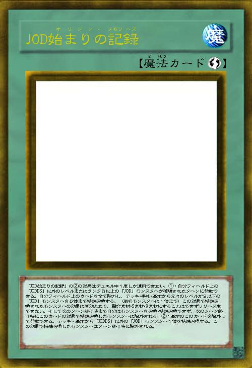 | 「JOD始まりの記録」の②の効果はデュエル中1度しか適用できない。①:自分フィールド上の「JODDS」以外のレベルまたはランク8以上の「JOD」モンスターが破壊されたターンに発動できる。自分フィールド上のカードを全て除外し、デッキ・手札・墓地から元々のレベルが3以下の「JOD」モンスターを5体まで特殊召喚する。(同名モンスターは1体まで)この効果で特殊召喚されたモンスターの効果は無効となり、融合素材・S素材・X素材にすることはできずリリースもできない。そして次のターン終了時まで自分はモンスターを召喚・特殊召喚できず、次のターン終了時にこのカードの効果で特殊召喚したモンスターは除外される。②:墓地のこのカードを除外して発動できる。デッキ・墓地から「JODDS」以外の「JOD」モンスター1体を特殊召喚する。この効果で特殊召喚したモンスターはターン終了時に除外される。 | |||