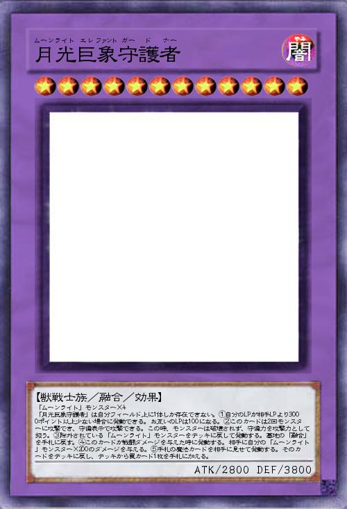 | 「ムーンライト」モンスター×4 「月光巨象守護者」は自分フィールド上に1体しか存在できない。①自分のLPが相手LPより3000ポイント以上少ない場合に発動できる。お互いのLPは100になる。②このカードは2回モンスターに攻撃でき、守備表示で攻撃できる。この時、モンスターは破壊されず、守備力を攻撃力として扱う。③除外されている「ムーンライト」モンスターをデッキに戻して発動する。墓地の「融合」を手札に戻す。④このカードが戦闘ダメージを与えた時に発動する。相手に自分の「ムーンライト」モンスター×200のダメージを与える。⑤手札の魔法カードを相手に見せて発動する。そのカードをデッキに戻し、デッキから罠カード1枚を手札に加える。 | |||