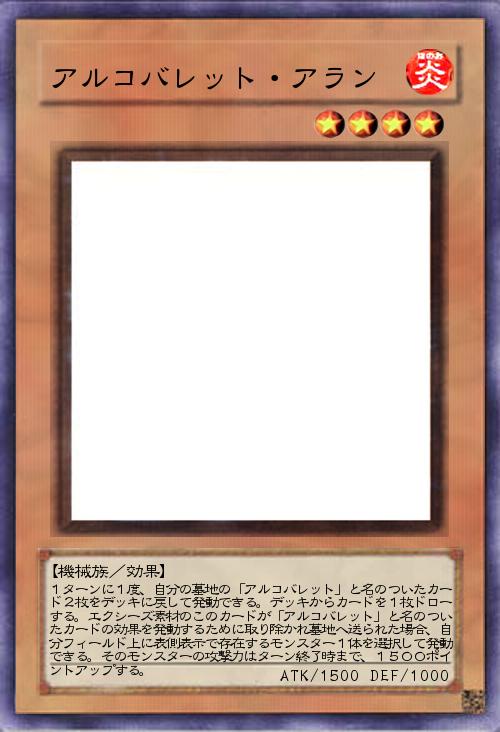 | 1ターンに1度、自分の墓地の「アルコバレット」と名のついたカード2枚をデッキに戻して発動できる。デッキからカードを1枚ドローする。エクシーズ素材のこのカードが「アルコバレット」と名のついたカードの効果を発動するために取り除かれ墓地へ送られた場合、自分フィールド上に表側表示で存在するモンスター1体を選択して発動できる。そのモンスターの攻撃力はターン終了時まで、1500ポイントアップする。 | |||