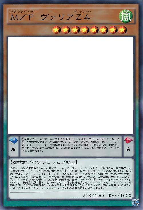 | ①:自分フィールドの「M/F」モンスターと「マルチ・フォーメーション・トークン」1体ずつを対象として発動できる。ターン終了時まで、対象の「マルチ・フォーメーション・トークン」を攻撃力1000アップの装備カード扱いとして、対象の「M/F」モンスターに装備する。この効果は1ターンに2度まで使用でき、相手ターンでも使用できる。 | |||