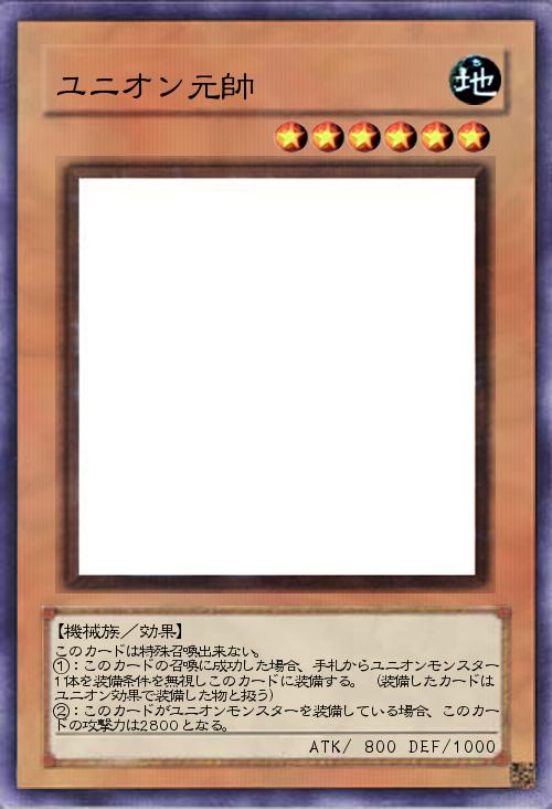 | このカードは特殊召喚出来ない。 ①:このカードの召喚に成功した場合、手札からユニオンモンスター1体を装備条件を無視しこのカードに装備する。(装備したカードはユニオン効果で装備した物と扱う) ②:このカードがユニオンモンスターを装備している場合、このカードの攻撃力は2800となる。 | |||