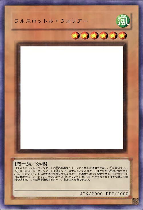 | 「フルスロットル・ウォリアー」の②の効果は1ターンに1度しか使用できない。①:自分フィールドの「スピード・ウォリアー」1体をリリースすることでこのカードは手札から特殊召喚できる。②:自分フィールドに表側表示で存在するこのカードを墓地へ送って発動できる。自分のデッキ及び墓地から「シンクロン」モンスターと「ウォリアー」モンスターをそれぞれ1体ずつ選んで特殊召喚する。この効果を発動するターン、自分はX召喚できない。 | |||