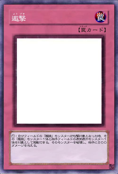 | ①:自分フィールドの「艦娘」モンスターが攻撃対象となった時、その「艦娘」モンスター1体と相手フィールドの表側表示モンスター1体を対象として発動できる。そのモンスターを破壊し、相手に500ダメージを与える。 | |||
