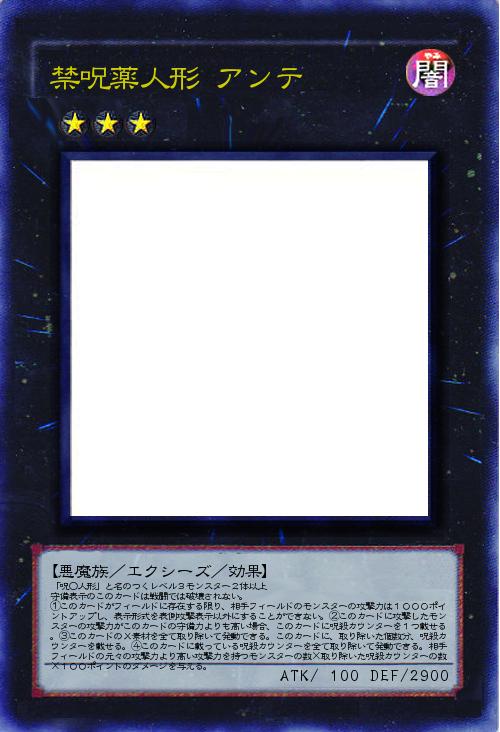 | 「呪○人形」と名のつくレベル3モンスター2体以上 守備表示のこのカードは戦闘では破壊されない。 ①このカードがフィールドに存在する限り、相手フィールドのモンスターの攻撃力は1000ポイントアップし、表示形式を表側攻撃表示以外にすることができない。②このカードに攻撃したモンスターの攻撃力がこのカードの守備力よりも高い場合、このカードに呪殺カウンターを1つ載せる。③このカードのX素材を全て取り除いて発動できる。このカードに、取り除いた個数分、呪殺カウンターを載せる。④このカードに載っている呪殺カウンターを全て取り除いて発動できる。相手フィールドの元々の攻撃力より高い攻撃力を持つモンスターの数×取り除いた呪殺カウンターの数×100ポイントのダメージを与える。 | |||