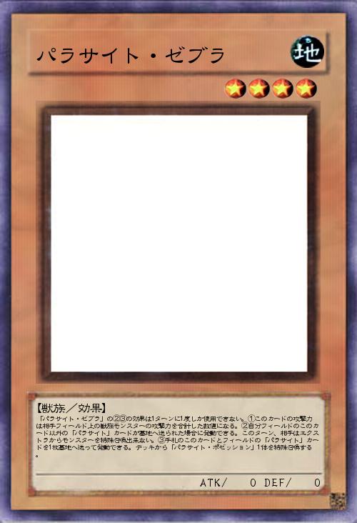 | 「パラサイト・ゼブラ」の②③の効果は1ターンに1度しか使用できない。①このカードの攻撃力は相手フィールド上の獣族モンスターの攻撃力を合計した数値になる。②自分フィールドのこのカード以外の「パラサイト」カードが墓地へ送られた場合に発動できる。このターン、相手はエクストラからモンスターを特殊召喚出来ない。③手札のこのカードとフィールドの「パラサイト」カードを1枚墓地へ送って発動できる。デッキから「パラサイト・ポゼッション」1体を特殊召喚する。 | |||
