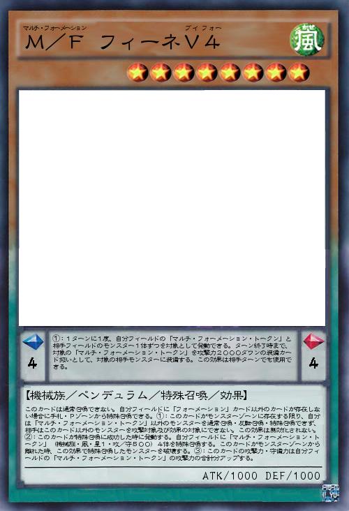 | ①:1ターンに1度、自分フィールドの「マルチ・フォーメーション・トークン」と相手フィールドのモンスター1体ずつを対象として発動できる。ターン終了時まで、対象の「マルチ・フォーメーション・トークン」を攻撃力2000ダウンの装備カード扱いとして、対象の相手モンスターに装備する。この効果は相手ターンでも使用できる。 | |||