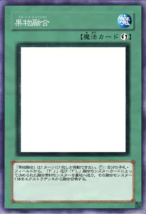 | 「果物融合」は1ターンに1枚しか発動できない。①:自分の手札・フィールドから、「FJ」及び「FL」融合モンスターカードによって決められた融合素材モンスターを墓地へ送り、その融合モンスター1体をエクストラデッキから融合召喚する。 | |||