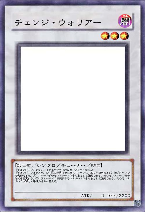 | 「チェンジ・シンクロン」+チューナー以外のモンスター1体以上 「チェンジ・ウォリアー」の①②の効果はそれぞれ1ターンに1度しか使用できず、相手ターンでも発動できる。①:フィールドのモンスター1体を対象として発動できる。そのモンスターの表示形式を変更する。②:フィールドの表側表示モンスター1体を対象として発動できる。そのモンスターの攻撃力・守備力を入れ替える。 | |||
