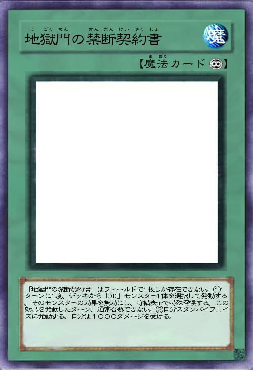 | 「地獄門の禁断契約書」はフィールドで1枚しか存在できない。①1ターンに1度、デッキから「DD」モンスター1体を選択して発動する。そのモンスターの効果を無効にし、守備表示で特殊召喚する。この効果を発動したターン、通常召喚できない。②自分スタンバイフェイズに発動する。自分は1000ダメージを受ける。 | |||