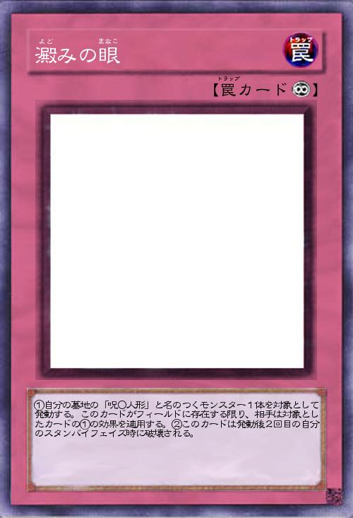 | ①自分の墓地の「呪○人形」と名のつくモンスター1体を対象として発動する。このカードがフィールドに存在する限り、相手は対象としたカードの①の効果を適用する。②このカードは発動後2回目の自分のスタンバイフェイズ時に破壊される。 | |||