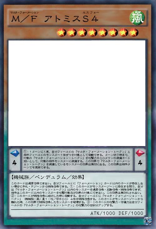 | ①:1ターンに1度、自分フィールドの「マルチ・フォーメーション・トークン」と相手フィールドのモンスター1体ずつを対象として発動できる。ターン終了時まで、対象の「マルチ・フォーメーション・トークン」を攻撃力500ダウンの装備カード扱いとして、対象の相手モンスターに装備する。この効果で「マルチ・フォーメーション・トークン」を装備しているモンスターの効果は無効になる。この効果は相手ターンでも使用できる。 | |||