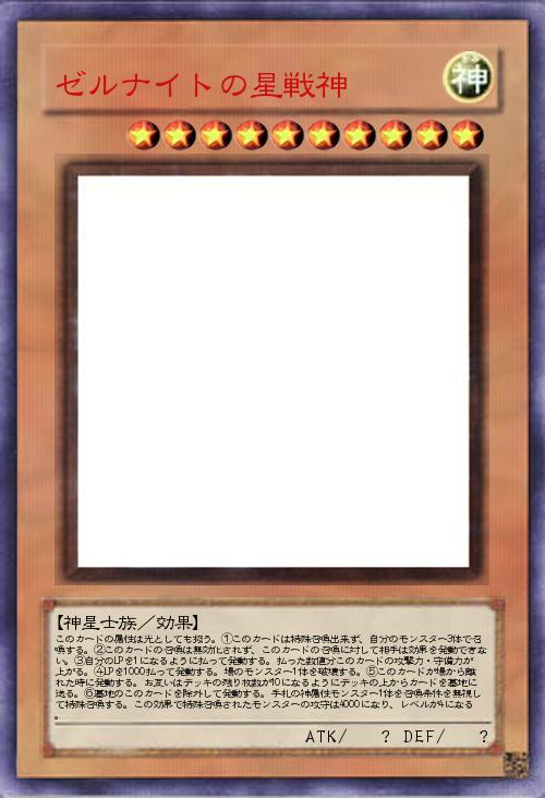 | このカードの属性は光としても扱う。①このカードは特殊召喚出来ず、自分のモンスター3体で召喚する。②このカードの召喚は無効化されず、このカードの召喚に対して相手は効果を発動できない。③自分のLPを1になるように払って発動する。払った数値分このカードの攻撃力・守備力が上がる。④LPを1000払って発動する。場のモンスター1体を破壊する。⑤このカードが場から離れた時に発動する。お互いはデッキの残り枚数が10になるようにデッキの上からカードを墓地に送る。⑥墓地のこのカードを除外して発動する。手札の神属性モンスター1体を召喚条件を無視して特殊召喚する。この効果で特殊召喚されたモンスターの攻守は4000になり、レベルが4になる。 | |||