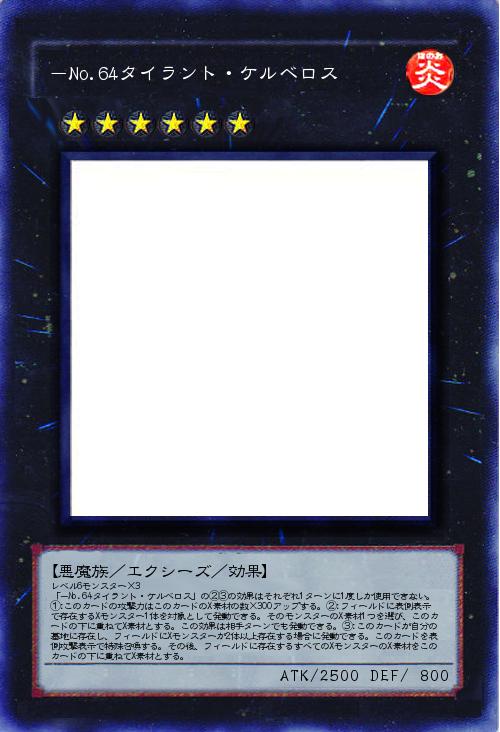 | レベル6モンスター×3 「-No.64タイラント・ケルベロス」の②③の効果はそれぞれ1ターンに1度しか使用できない。①:このカードの攻撃力はこのカードのX素材の数×300アップする。②:フィールドに表側表示で存在するXモンスター1体を対象として発動できる。そのモンスターのX素材1つを選び、このカードの下に重ねてX素材とする。この効果は相手ターンでも発動できる。③:このカードが自分の墓地に存在し、フィールドにXモンスターが2体以上存在する場合に発動できる。このカードを表側攻撃表示で特殊召喚する。その後、フィールドに存在するすべてのXモンスターのX素材をこのカードの下に重ねてX素材とする。 | |||