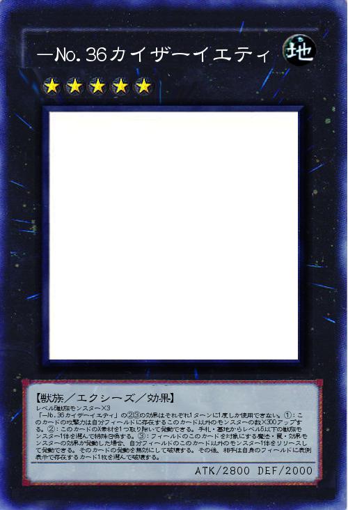 | レベル5獣族モンスター×3 「-No.36カイザーイエティ」の②③の効果はそれぞれ1ターンに1度しか使用できない。①:このカードの攻撃力は自分フィールドに存在するこのカード以外のモンスターの数×300アップする。②:このカードのX素材を1つ取り除いて発動できる。手札・墓地からレベル5以下の獣族モンスター1体を選んで特殊召喚する。③:フィールドのこのカードを対象にする魔法・罠・効果モンスターの効果が発動した場合、自分フィールドのこのカード以外のモンスター1体をリリースして発動できる。そのカードの発動を無効にして破壊する。その後、相手は自身のフィールドに表側表示で存在するカード1枚を選んで破壊する。 | |||
