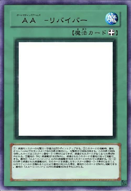 | ①:装備モンスターの攻撃力・守備力は500ポイントアップする。②このカードの発動時、墓地からレベル4以下のモンスター1体の効果を無効にし、攻撃表示で特殊召喚する。この効果で特殊召喚したカードはこのターン融合・S・X素材にはできず、装備されたカードがなくなった場合除外される。③墓地の「AA」装備魔法1枚を除外し、装備されたこのカードを墓地に送って発動できる。墓地の「AAーリバイバー」以外の装備魔法1枚をこのカードの代わりに装備する。④:②の効果で装備された装備魔法が、そのカードを装備したモンスターが融合・S・X素材になること以外でフィールドを離れることにより墓地に送られた場合、墓地のこのカードを除外し発動できる。墓地の「AAーリバイバー」以外の装備魔法2枚を手札に加える。 | |||