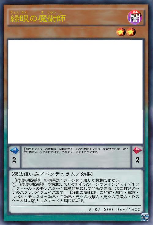 | 「緑眼の魔術師」の効果は1ターンに1度しか発動できない。 ①「緑眼の魔術師」が発動していない自分ターンのメインフェイズ1に、フィールドのモンスター1体を対象にして発動できる。次の自分ターンのスタンバイフェイズまで、「緑眼の魔術師」の名前・属性・種族・レベル・モンスター効果・P効果・元々の攻撃力・元々の守備力・Pスケールは対象としたカードと同じになる。 | |||