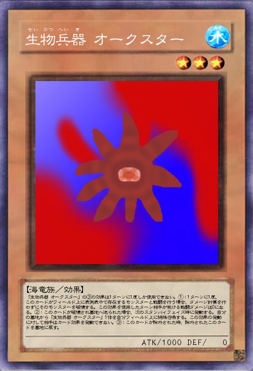 | 「生物兵器 オークスター」の③の効果は1ターンに1度しか使用できない。①:1ターンに1度、このカードがフィールド上に表側表示で存在するモンスターと戦闘を行う場合、ダメージ計算を行わずにそのモンスターを破壊する。この効果を使用したターン相手が受ける戦闘ダメージは0になる。②:このカードが破壊され墓地へ送られた場合、次のスタンバイフェイズ時に発動する。自分の墓地から「生物兵器 オークスター」1体を自分フィールド上に特殊召喚する。この効果の発動に対して相手はカード効果を発動できない。③:このカードが除外された時、除外されたこのカードを墓地に戻す。 | |||