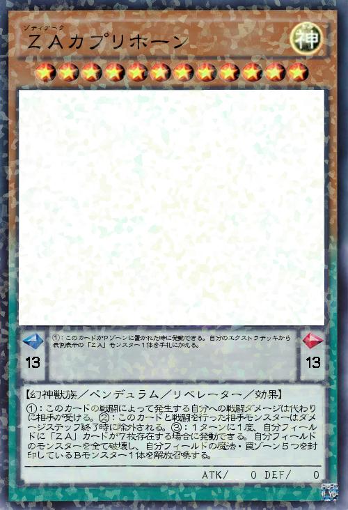 | ①:このカードがPゾーンに置かれた時に発動できる。自分のエクストラデッキから表側表示の「ZA」モンスター1体を手札に加える。 | |||