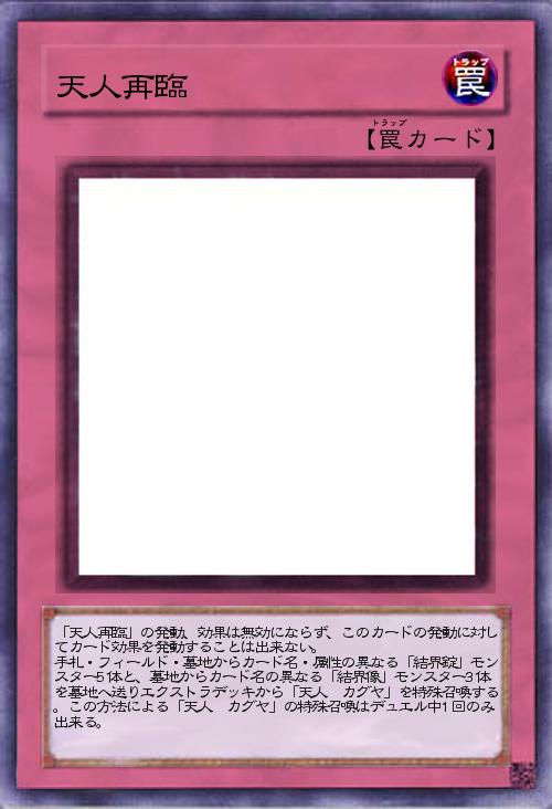 | 「天人再臨」の発動、効果は無効にならず、このカードの発動に対してカード効果を発動することは出来ない。 手札・フィールド・墓地からカード名・属性の異なる「結界錠」モンスター5体と、墓地からカード名の異なる「結界像」モンスター3体を墓地へ送りエクストラデッキから「天人 カグヤ」を特殊召喚する。この方法による「天人 カグヤ」の特殊召喚はデュエル中1回のみ出来る。 | |||