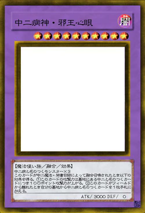 | 中二病と名のつくモンスター×3 このカードが中二魔法・禁書目録によって融合召喚されたとき以下の効果を得る。①このカードの攻撃力は墓地にある中二と名のつくカードにつき100ポイント攻撃力が上がる。②このカードがフィールドから離れたとき自分の墓地から中二病と名のつくカードを1枚手札に加える。 | |||